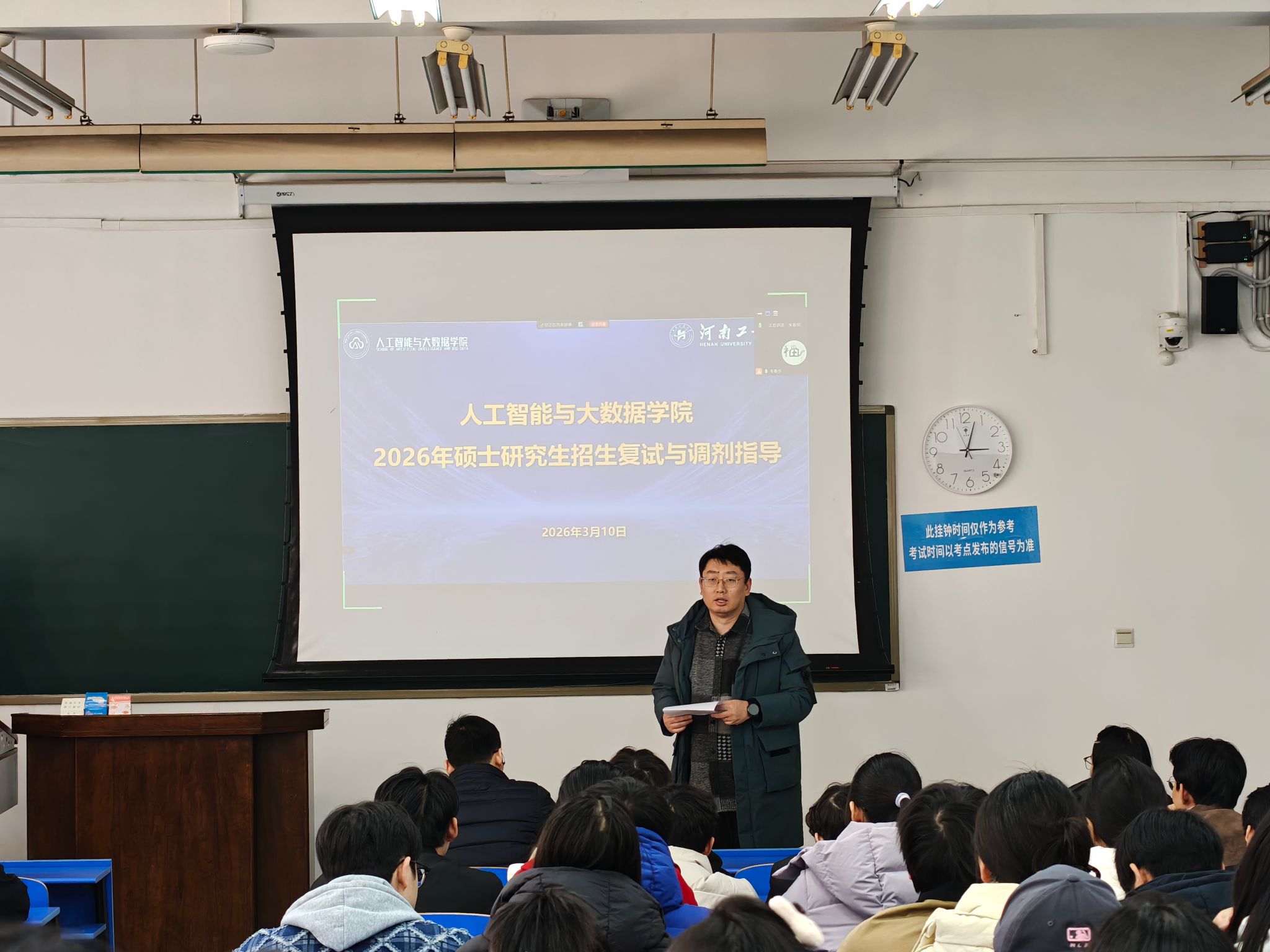在博学楼4136教室召开了2026届毕业生考研复试、调剂指导交流会。学院党委副书记赵志洋主持会议,副院长朱春华担任主讲嘉宾,各系系主任、全体辅导员、成功上岸的学生代表及考研学生共同参加了此次指导交流会。